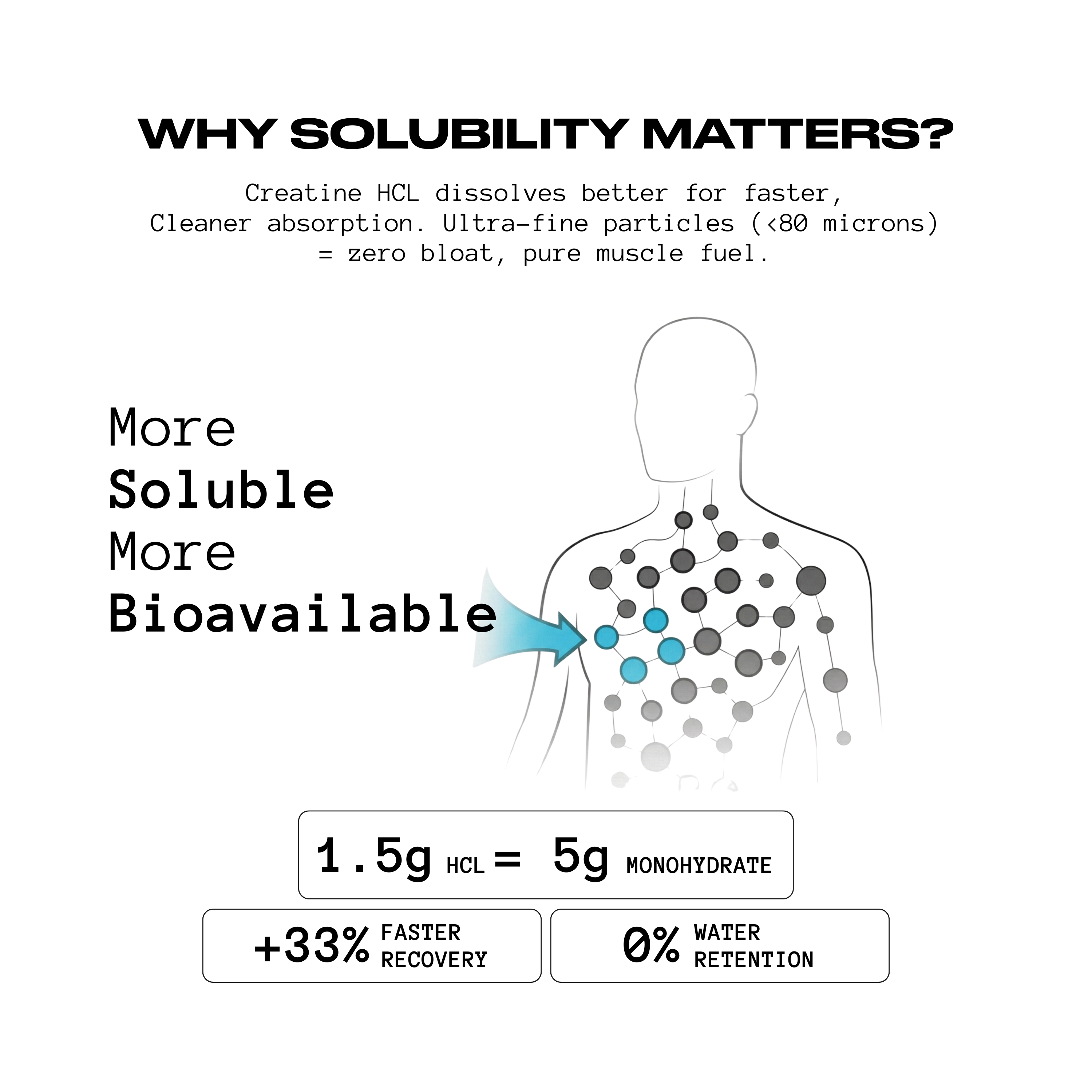 Creatine HCL delivers equal strength and size results at a lower dose—making it more efficient and easier on the gut.