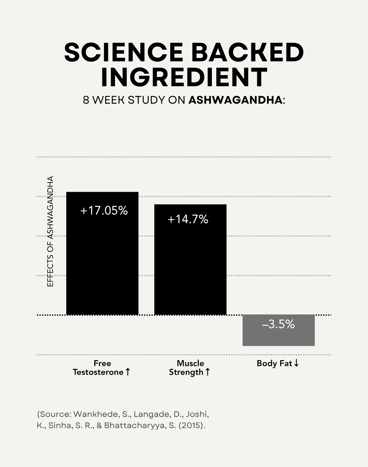 A double-blind, placebo-controlled trial showed that 600 mg/day of Ashwagandha significantly improved muscle strength, arm muscle size, testosterone levels, and reduced body fat in healthy men undergoing resistance training.