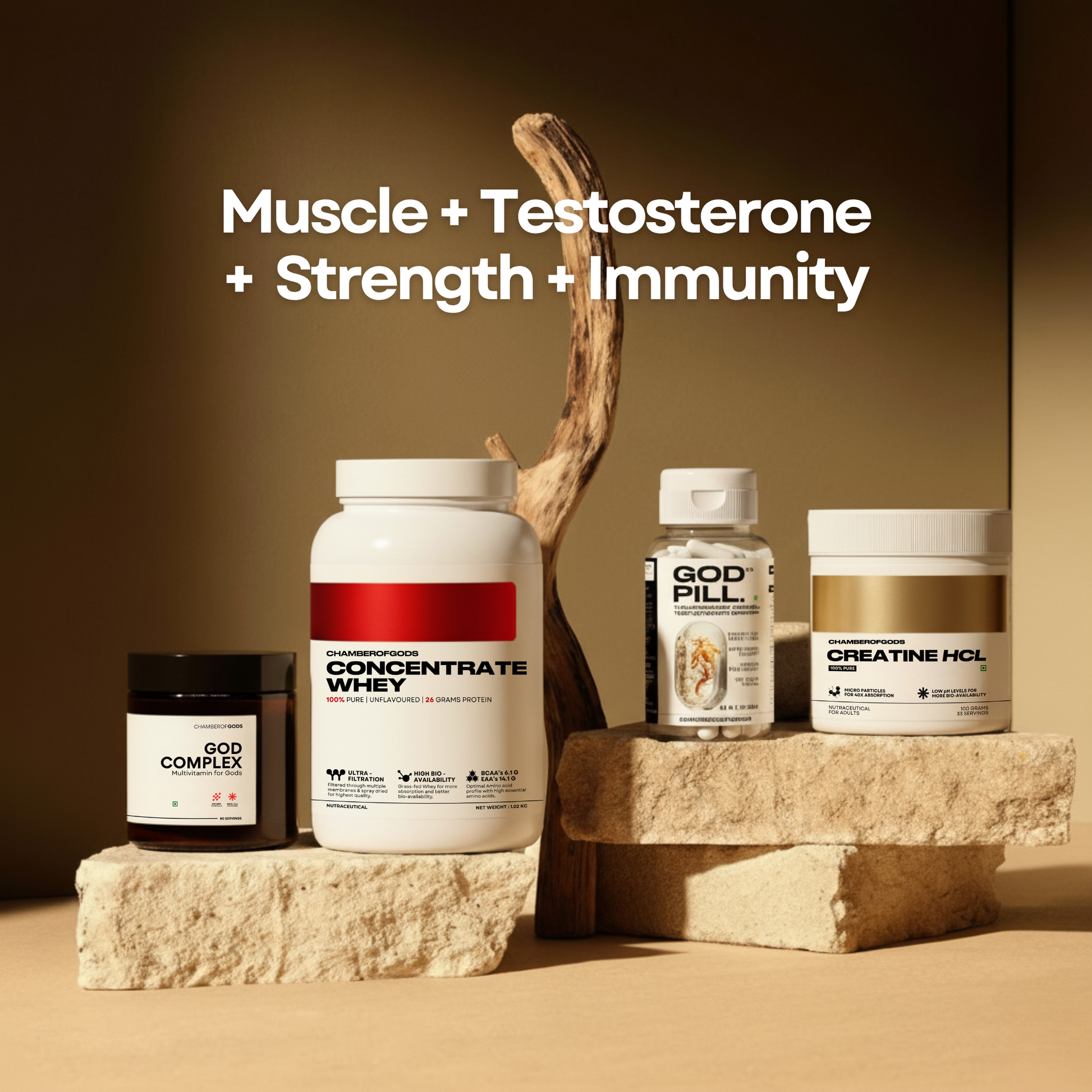 God Complex Multivitamins (60 servings) + 100% Pure Whey Concentrate (30 servings) + Godpill (30 servings) + 100% Pure Creatine Hcl (33 servings)